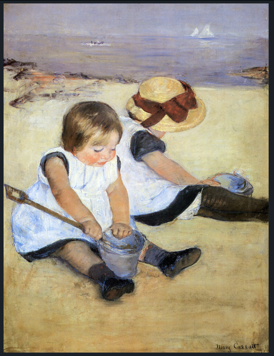 But when she went back to Europe and then went to Spain and then eventually went back to Paris, we have a lot of examples of her work.  One of the pieces I’m going to show you today is a picture of two children sitting on a beach.  We’re going to put this on the Internet. This is a black and white picture, but this picture is actually in color – it’s an oil painting. The reason I chose the two children sitting on the beach – this one that we’re going to paint today – is because I thought it was fairly simple, simple shapes and it would be easy for you to paint. It’s hard to paint people. (At least) not unless you’ve had a lot of lessons, it’s not easy to do.